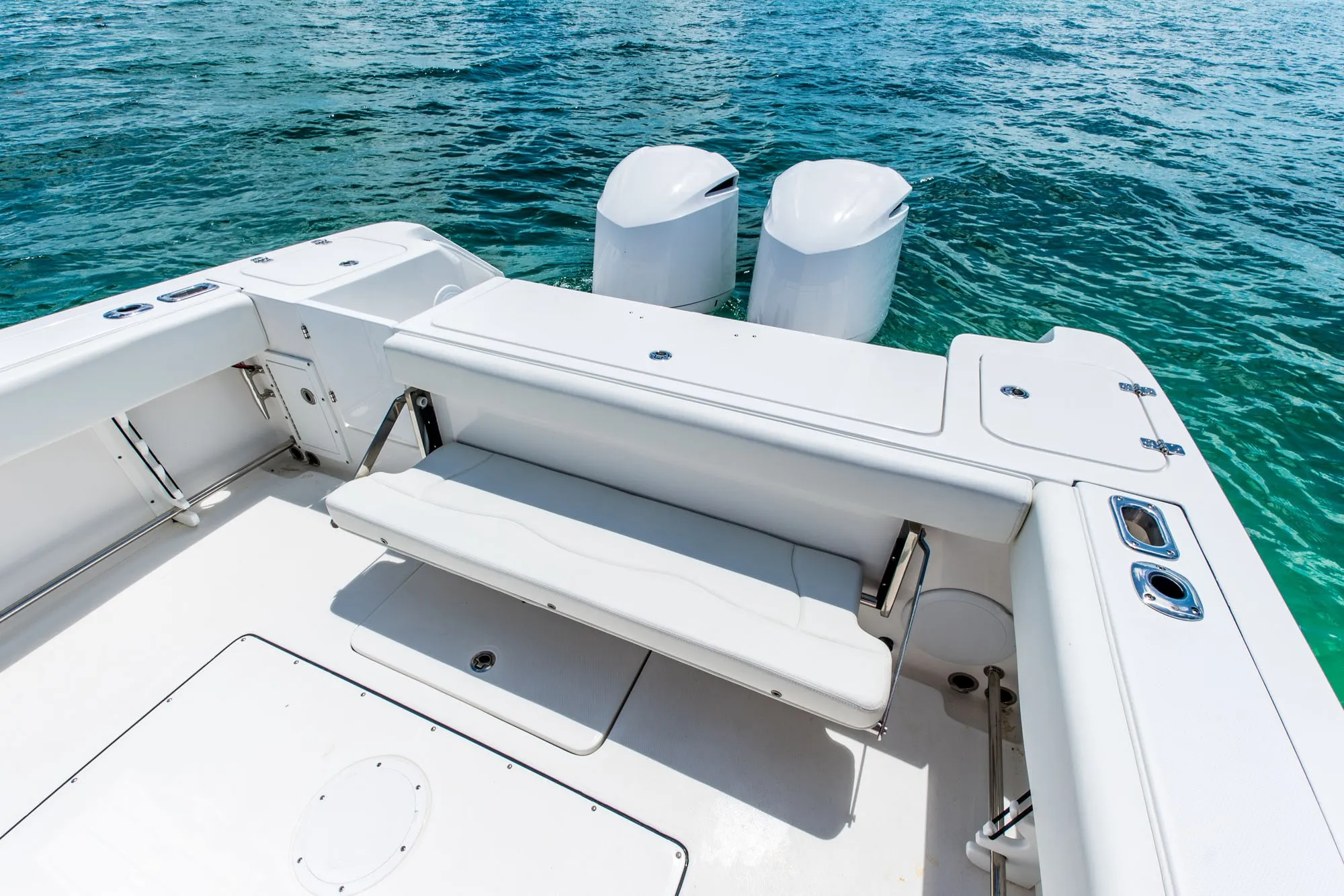 • Fiberglass Cooler Leaning Post w/ Removable 48QT Cooler, SS Fresh Water Sink, Pull-out Shower, Cutting Board, Storage Drawers, Aluminum Rod Holders (4), Grab Handle, Drink Holders (2) & Adjustable Flip-Bolster Helm Seats