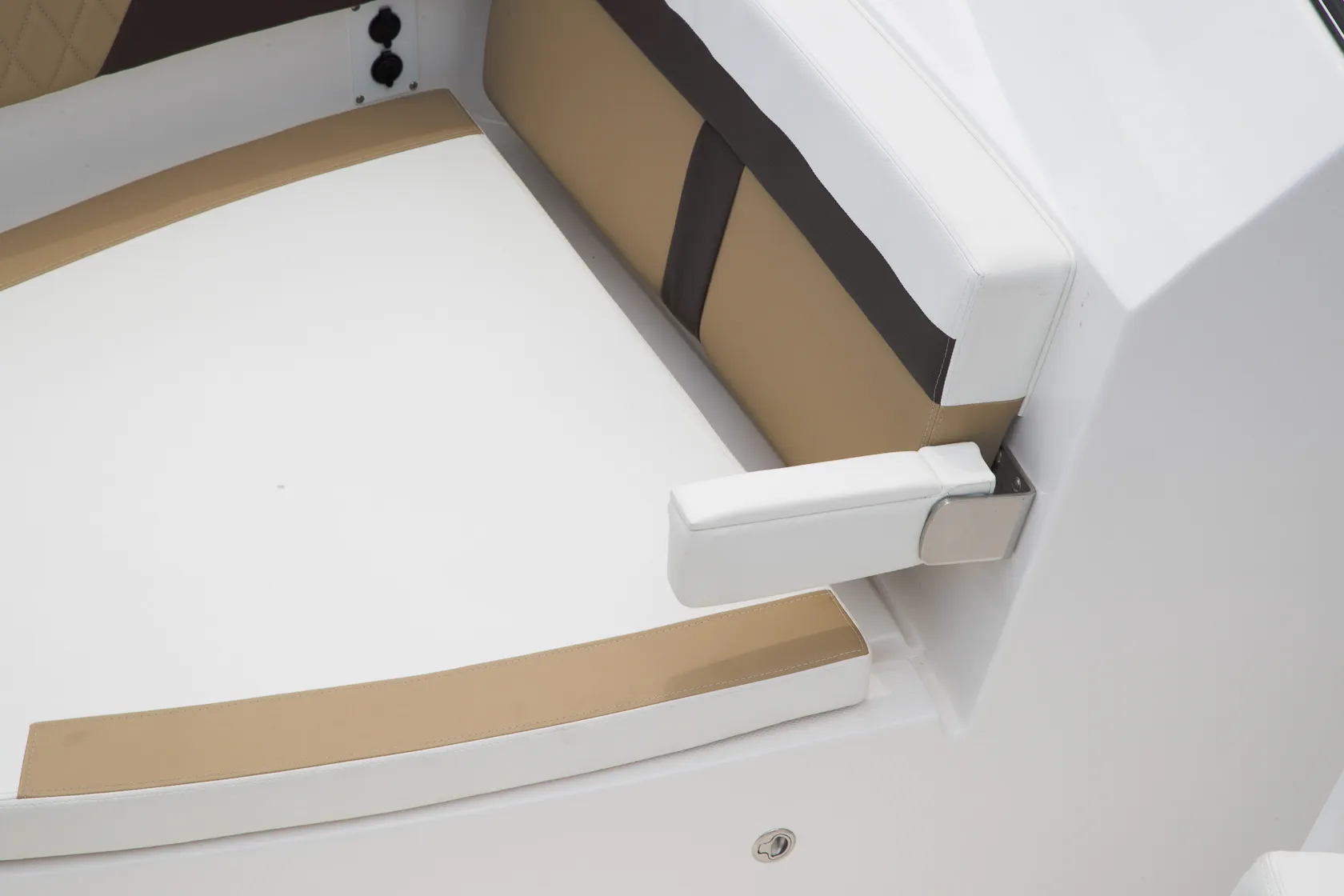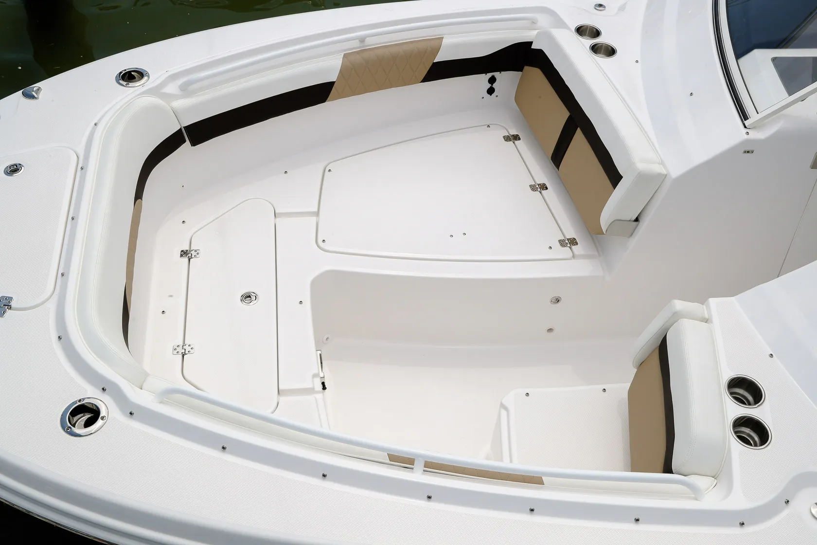 The deluxe helm seats with bolsters, starboard side ultra-lounger, and the expansive bow lounge area with armrests and an optional table provide ample space for everyone to relax and enjoy the ride. The enclosed head compartment with sink and optional shower adds extra convenience for extended trips.