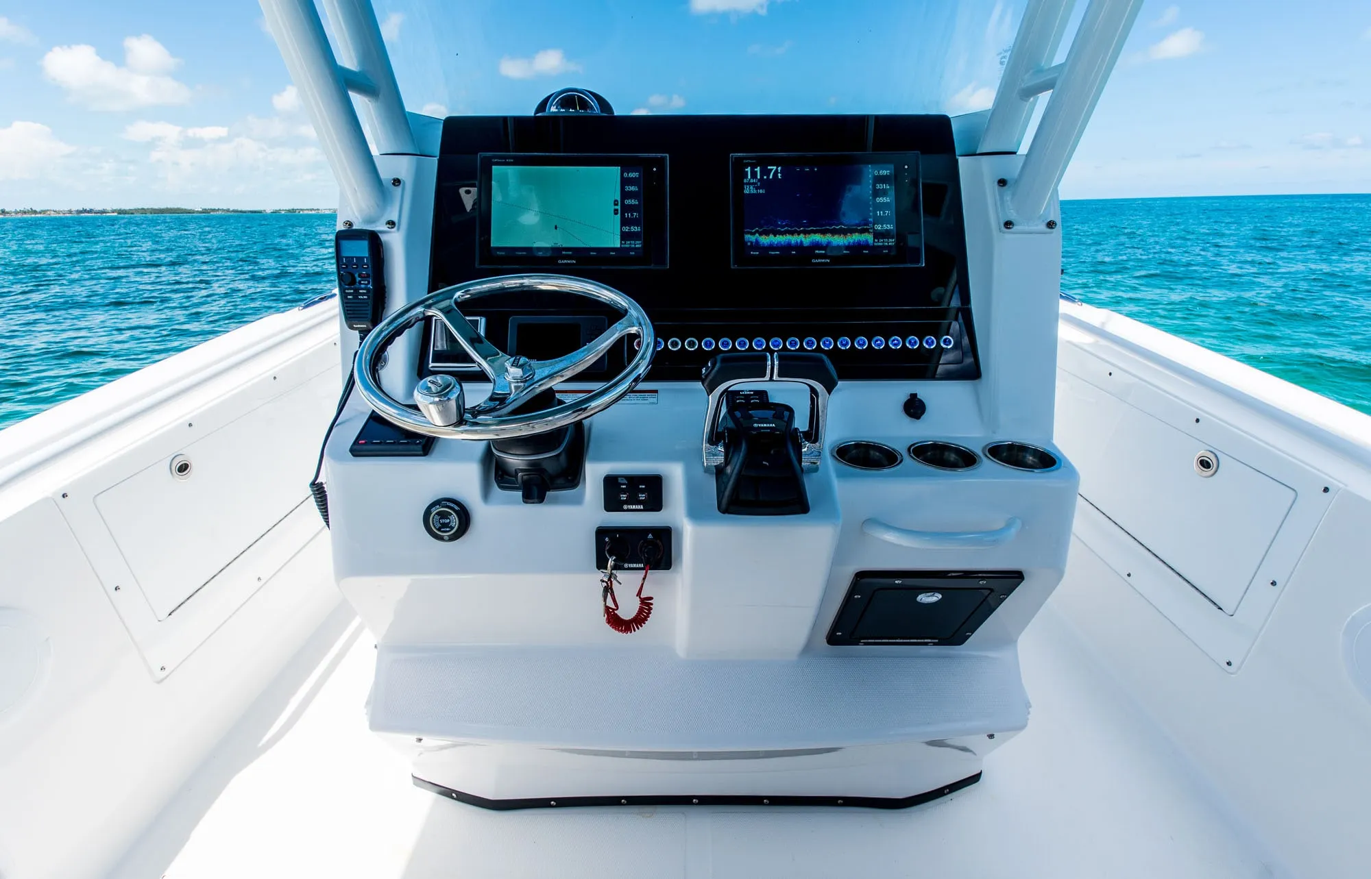 Powered by twin Yamaha outboards (up to 900hp), the 325CC boasts exhilarating performance and exceptional fuel efficiency. Its deep-V hull design with a Carolina flare effortlessly slices through waves, ensuring a smooth, dry ride even in rough seas, giving you the confidence to tackle any adventure.