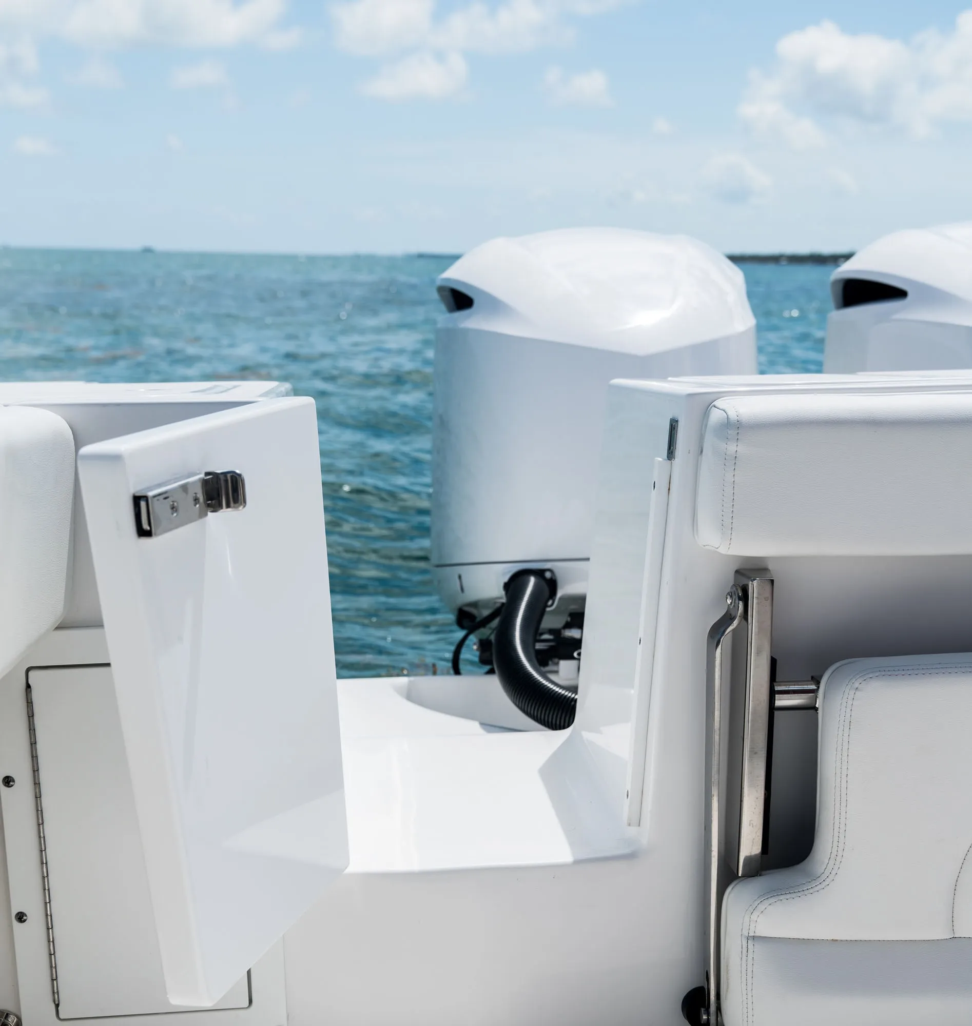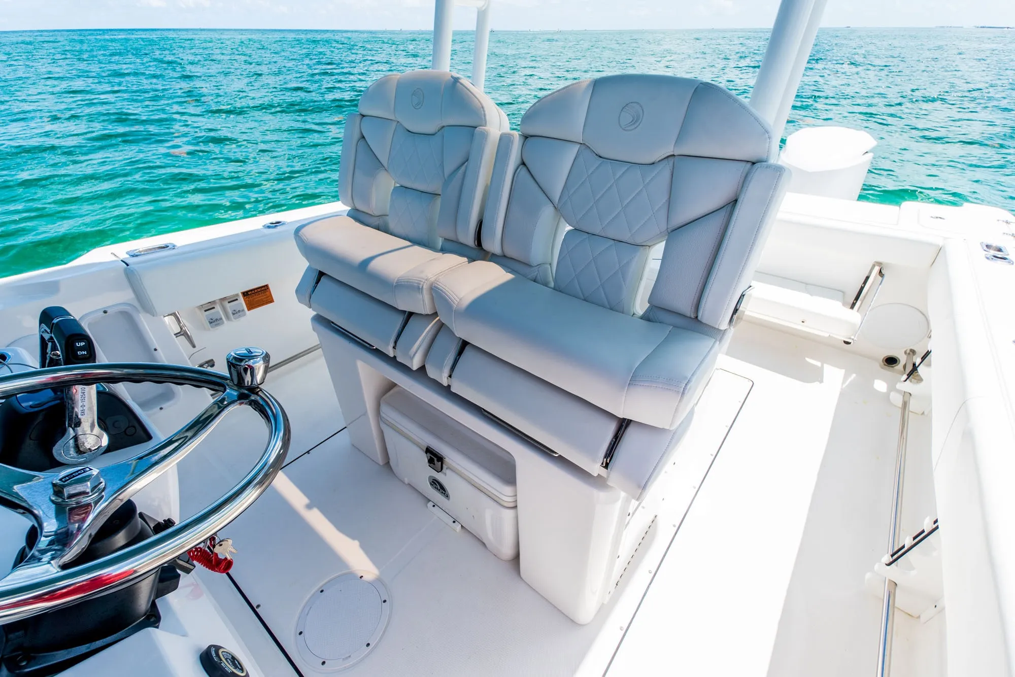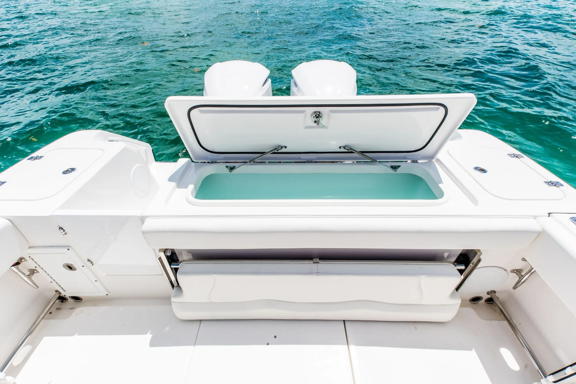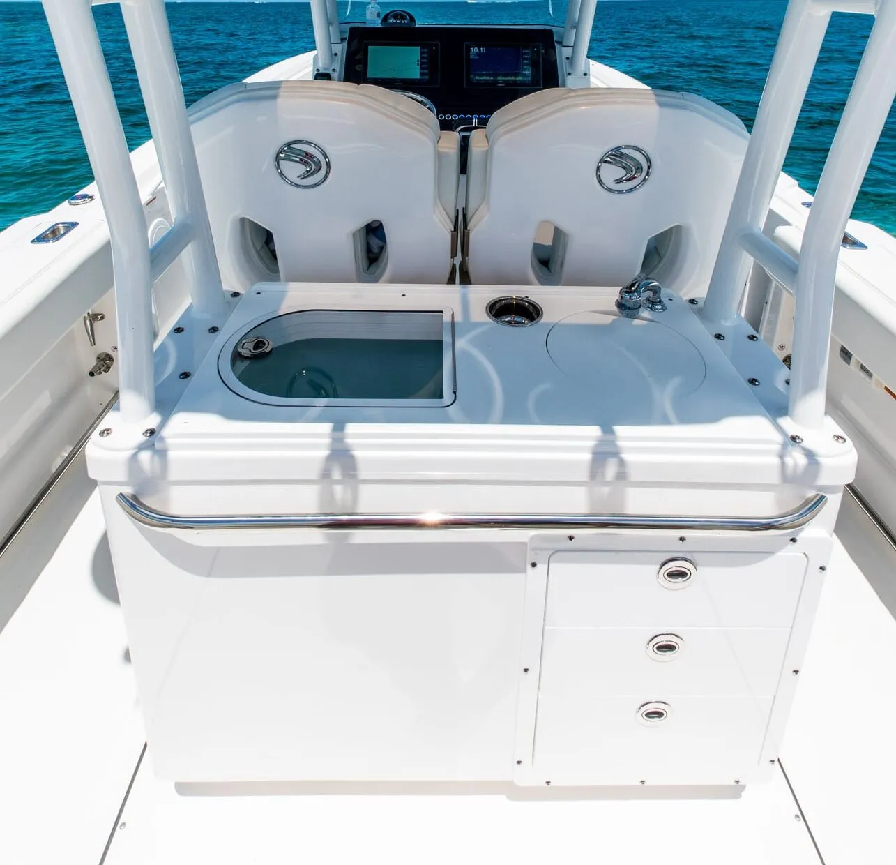 • Fiberglass Cooler Leaning Post w/ Removable 48QT Cooler, SS Fresh Water Sink, Pull-out Shower, Cutting Board, Storage Drawers, Aluminum Rod Holders (4), Grab Handle, Drink Holders (2) & Adjustable Flip-Bolster Helm Seats