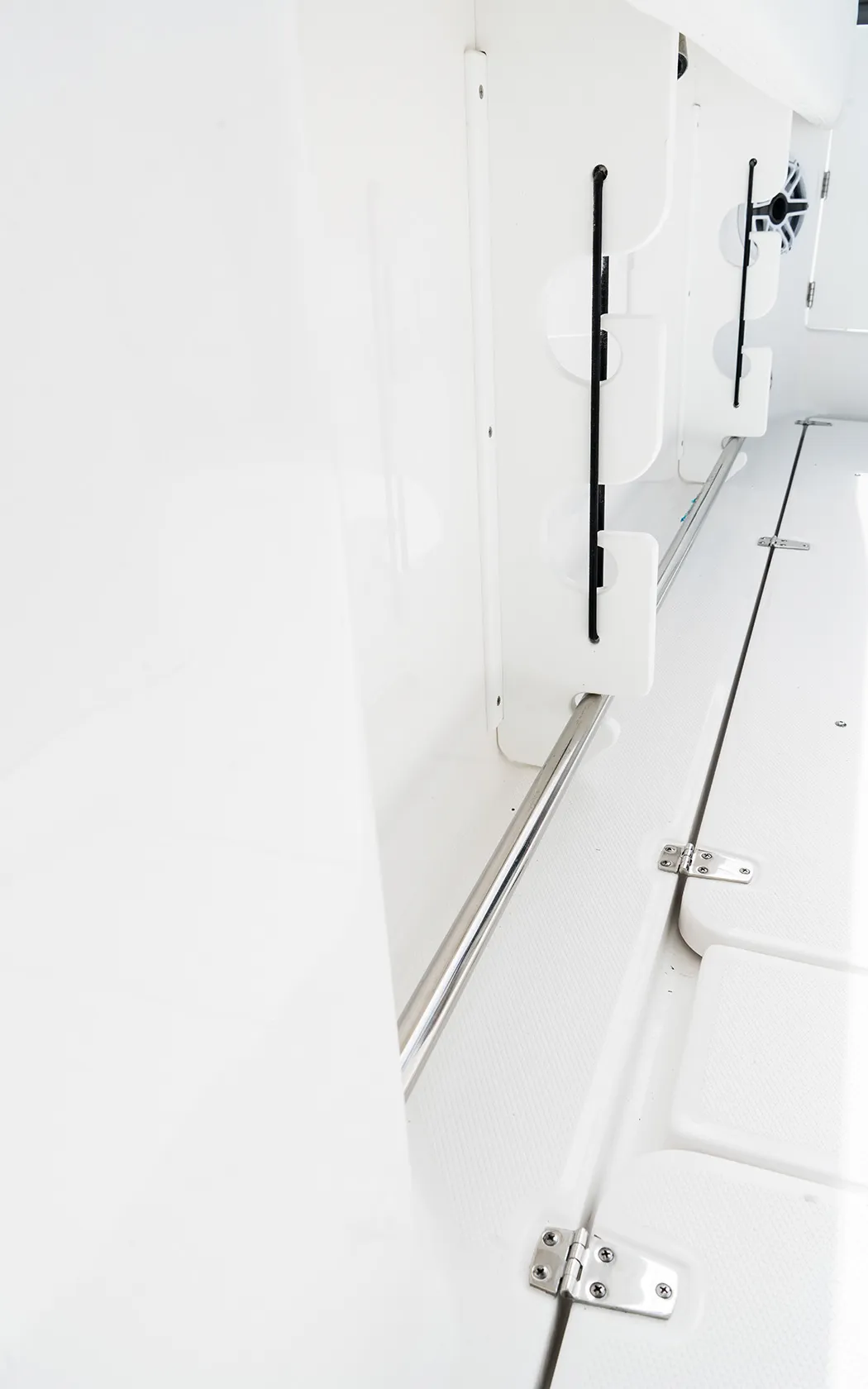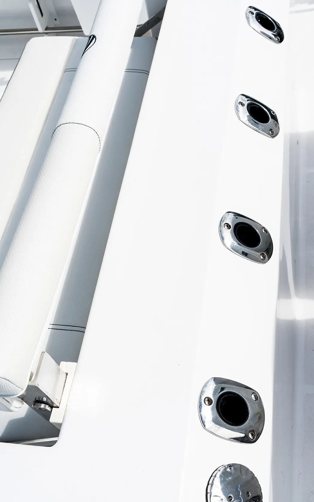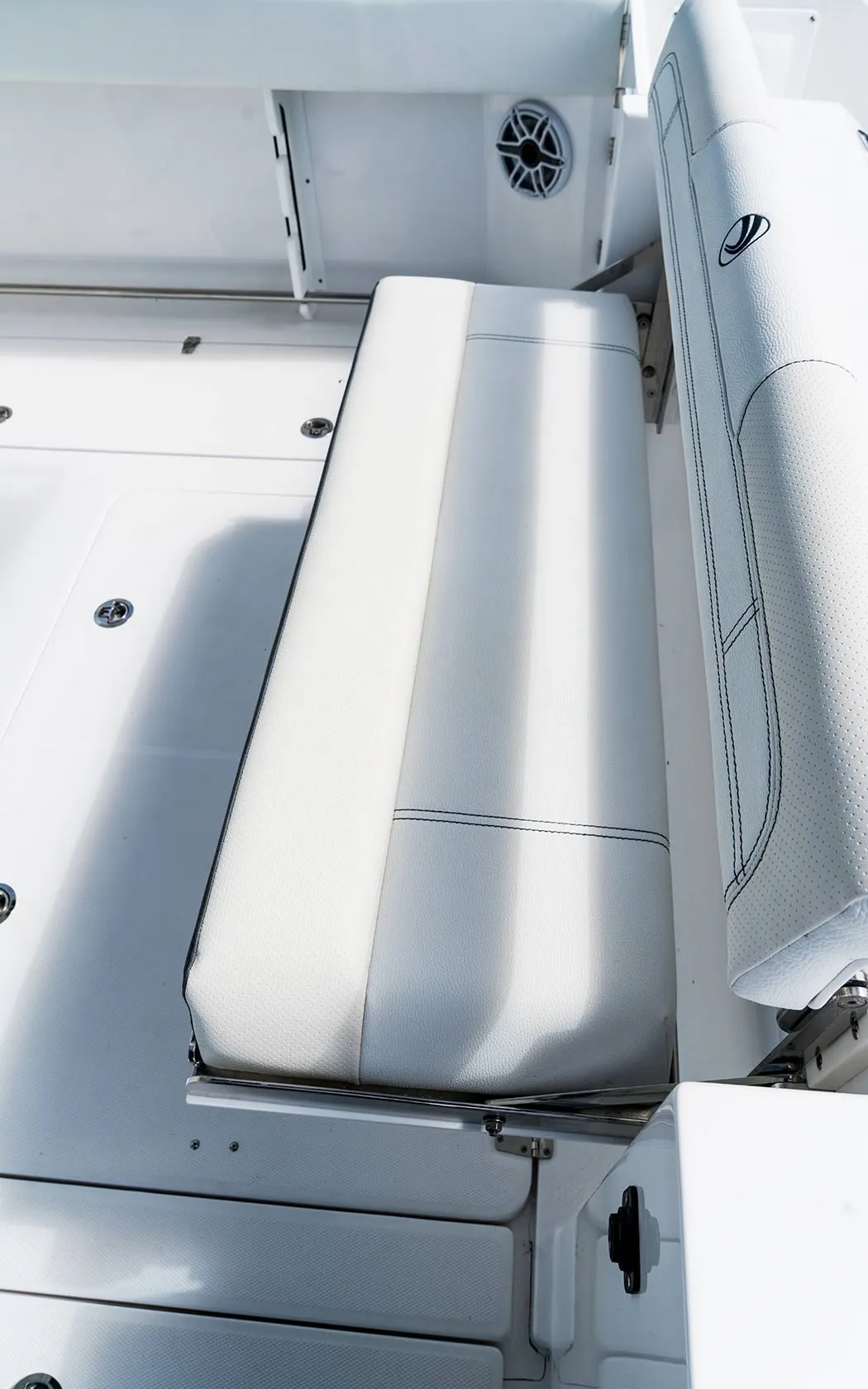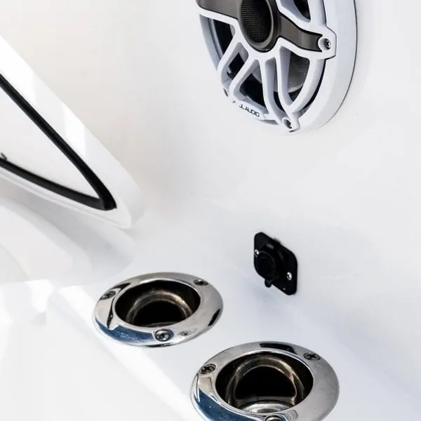 • Fiberglass Cooler Leaning Post w/ Removable 48QT Cooler, SS Fresh Water Sink, Pull-out Shower, Cutting Board, Storage Drawers, Aluminum Rod Holders (4), Grab Handle, Drink Holders (2) & Adjustable Flip-Bolster Helm Seats