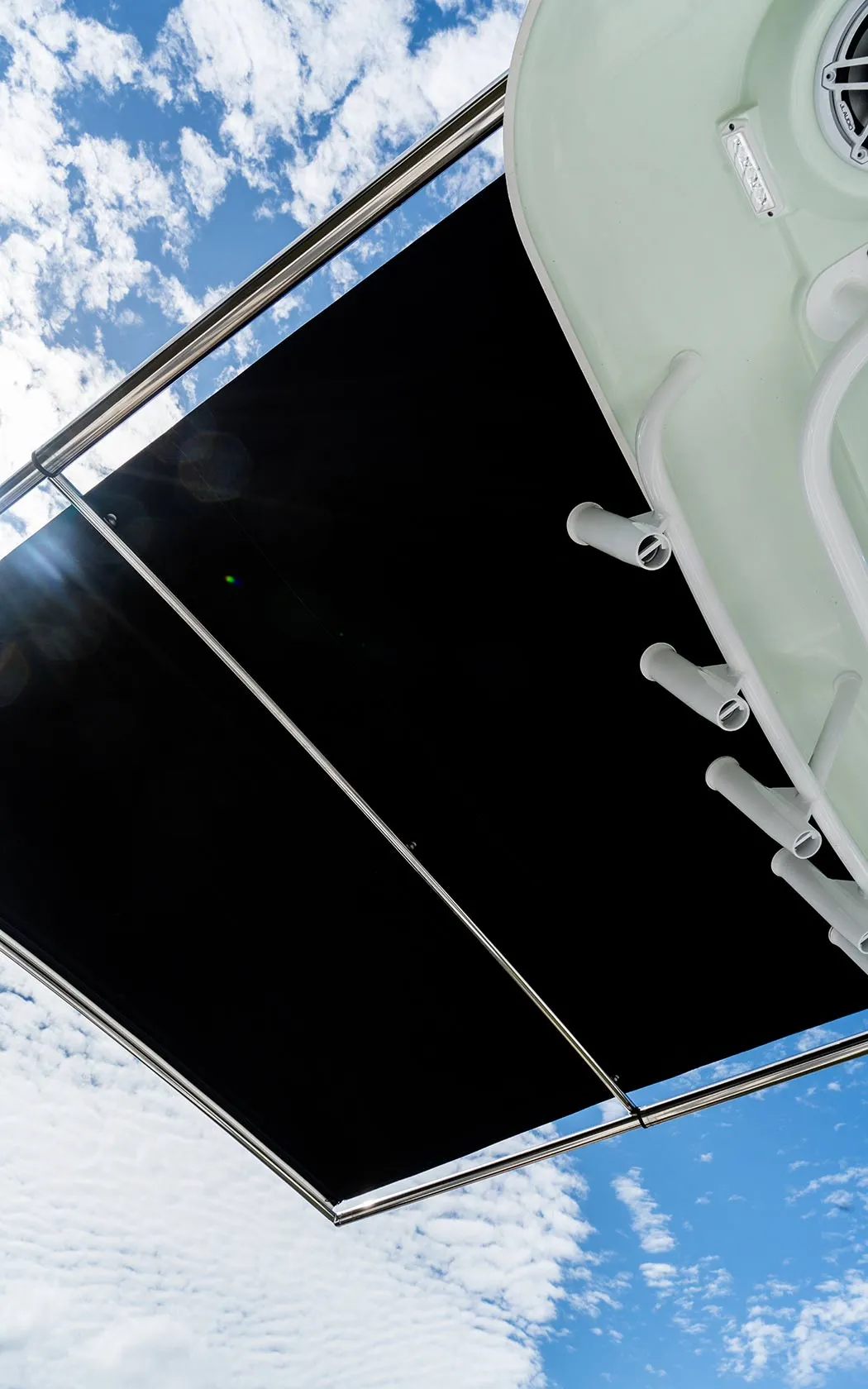 • Fiberglass Hardtop w/Rod Holders (6), LED Spreader Lights (2), Helm Light, Instrument Box, & Skylight